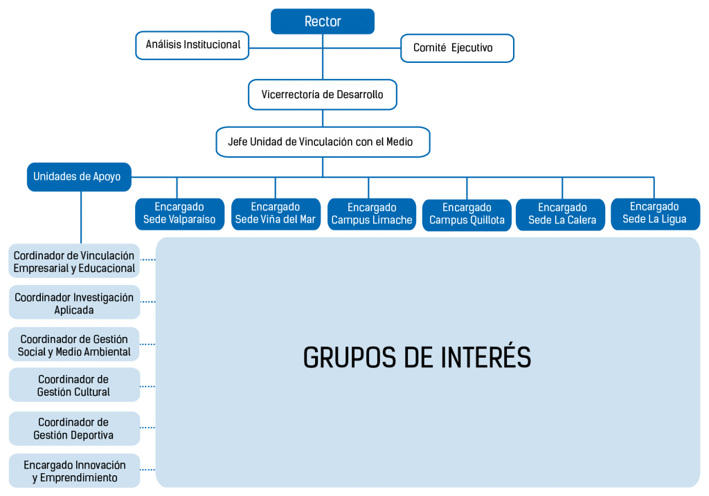 El trabajo de Vinculación con el Medio, es transversal a toda la organización, en donde la Dirección General establece las directrices y políticas generales para el cumplimiento de los objetivos formalizados en el Plan de Desarrollo Estratégico. Al mismo tiempo, las diversas vicerrectorías están convocadas al apoyo de la gestión de vinculación, así como los directores de los campus y sedes. Sin embargo, la aplicación de las políticas, la ejecución de las tareas, la medición de los resultados e impacto, así como el análisis de las mejoras potenciales, son responsabilidad de la Vicerrectoría de Desarrollo, la cual cuenta con una unidad de Vinculación con el Medio, cuyo organigrama funcional se muestra en la siguiente gráfica: